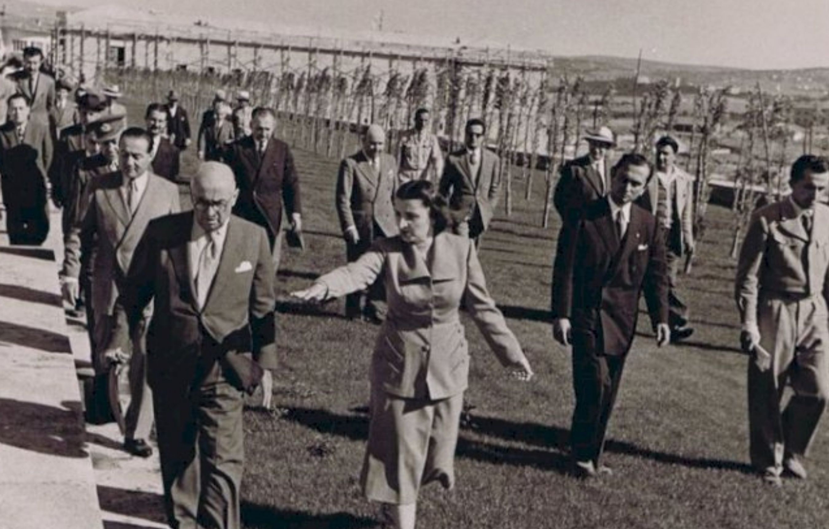 Anıtkabir inşaatı sürerken gerçekleştirilen resmî bir ziyarette, başkontrol mühendisi Sabiha Rıfat Gürayman şantiyedeki çalışmaları aktarırken görülüyor. Karede Gürayman; mimarlar Emin Onat ve Orhan Arda ile birlikte, dönemin Cumhurbaşkanı Celal Bayar ve Başbakanı Adnan Menderes yer alıyor.