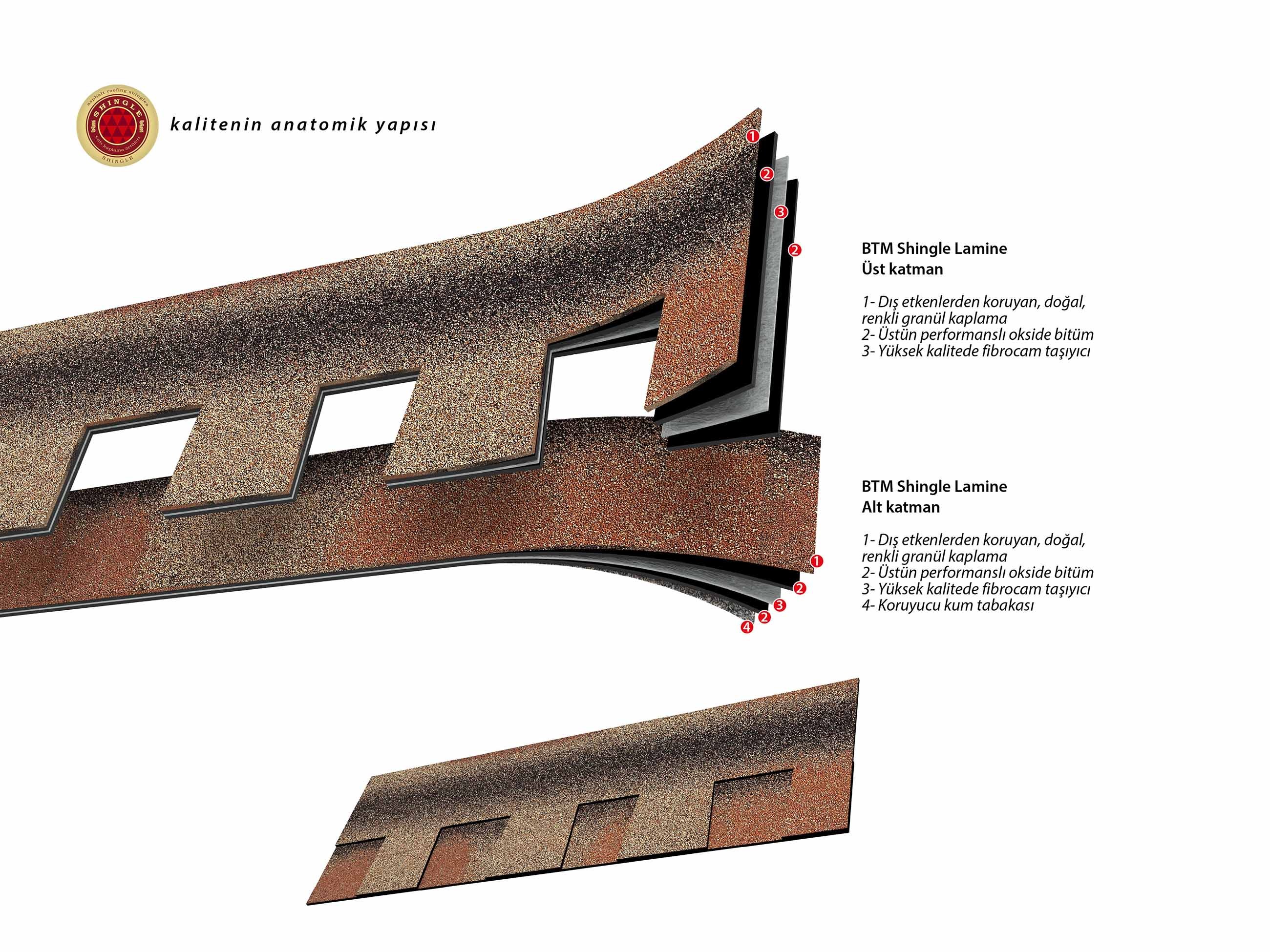 Cam tülü taşıyıcılı, okside bitümden üretilmiş ve renkli mineral granüllerle kaplanmış yapısı sayesinde BTM Shingle Lamine hem estetik hem de işlevsel performans sunuyor. Türkiye’de üretilen ilk lamine shingle olma özelliğini taşıyan BTM Shingle Lamine, sektörün öncü ürünleri arasında yer alıyor.
